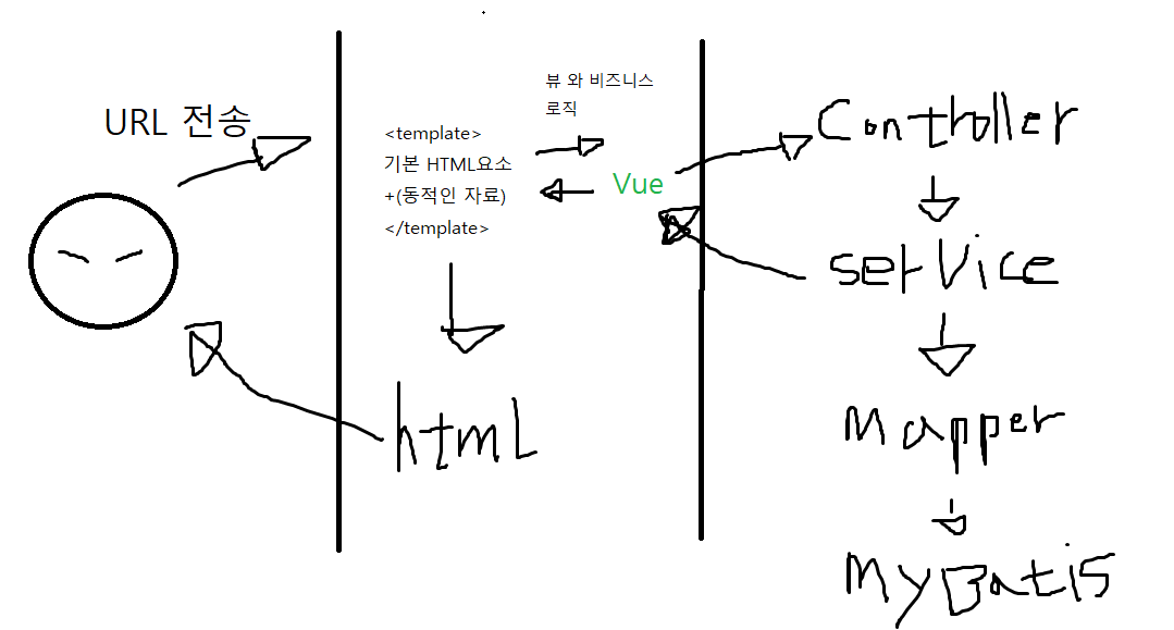 클라이언트가 URL을 요청하면 그 URL에 맞는 Vue파일에 바인딩한 요소들을 포함한다. 데이터베이스 내의 자료가 필요할 경우엔 Vue내에 정리되어있는 URL을 통해 controller에 닿고, service->mapper->myBatis를 거쳐 가공된 Html을